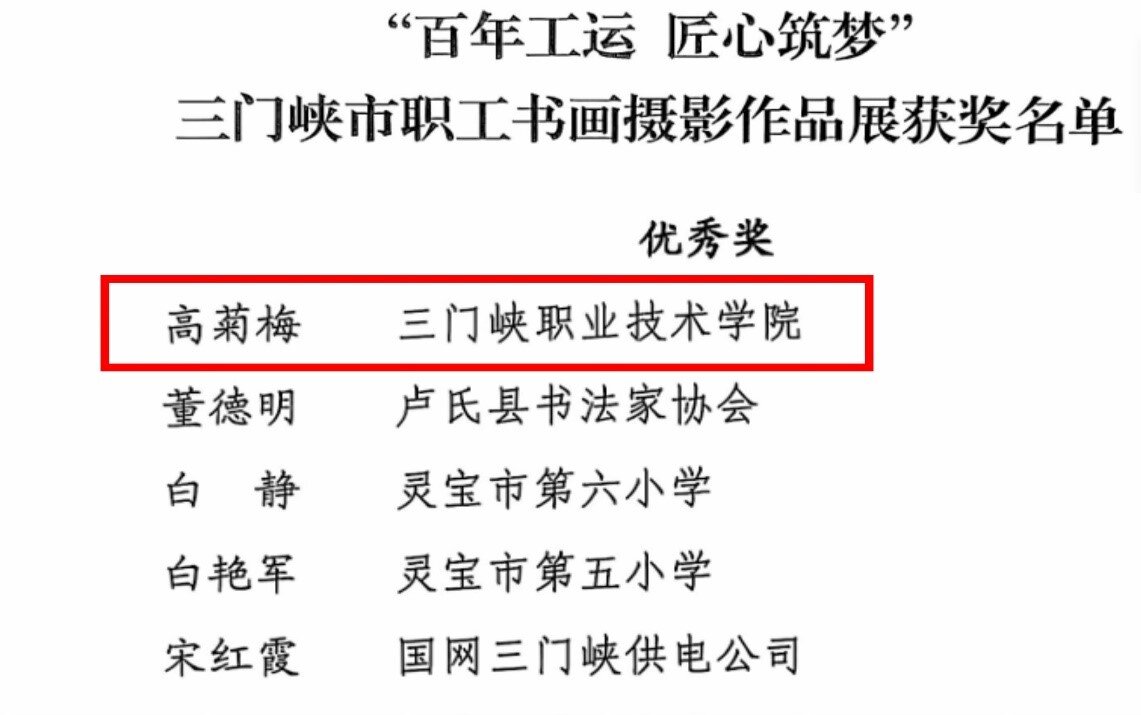 近日,在三门峡市总工会举办的“百年工运 匠心筑梦”全市职工书画摄影作品展活动中,我院教职工在学院工会的精心组织下踊跃参与,凭借出色作品脱颖而出、再创佳绩。