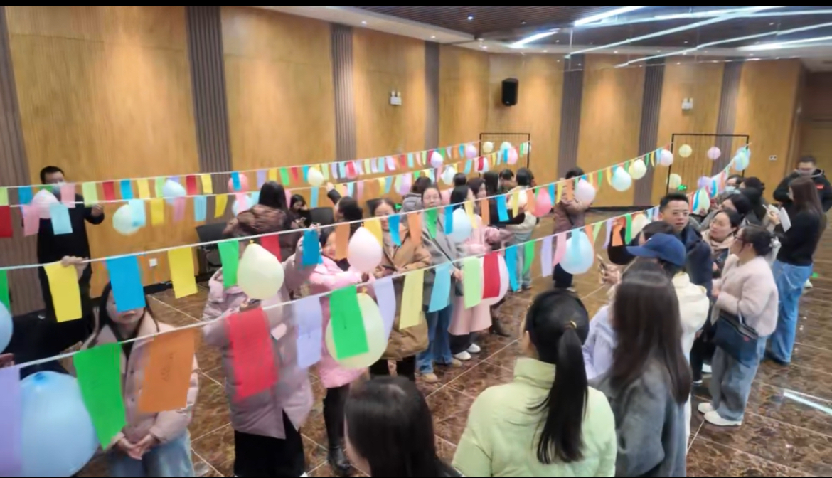 活动现场,500条五彩谜语彩条悬挂整齐,节日装饰洋溢着浓厚喜庆气氛。教职工们或凝神思考,或相互讨论,欢声笑语不断。猜中者喜笑颜开,前往兑奖区领取心仪奖品。